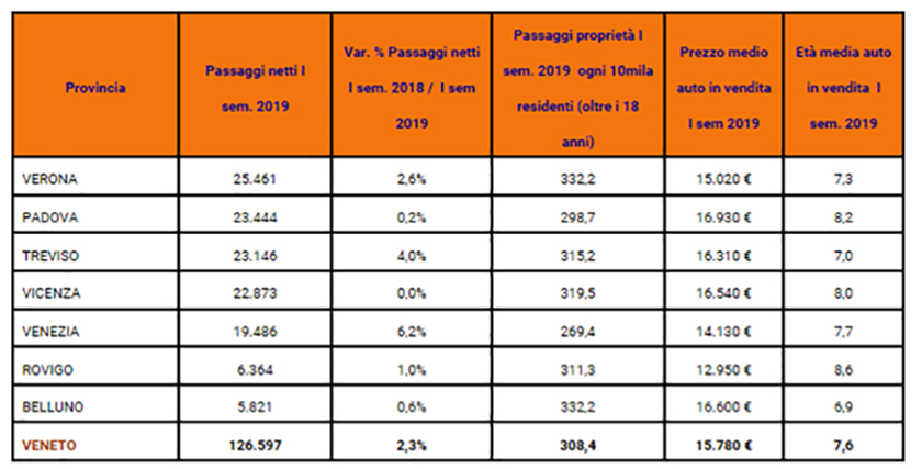 Analizzando i prezzi, nei primi sei mesi 2019 il prezzo medio relativo alla vendita si attesta a circa 15.780 euro, dato più alto rispetto alla media nazionale che ha registrato il prezzo di 13.530 euro come transazione media. Tra le province più costose per acquistare auto usate in Veneto troviamo Padova e Belluno, seguite da Vicenza, Treviso, Verona, Venezia, mentre la più economica risulta essere Rovigo.